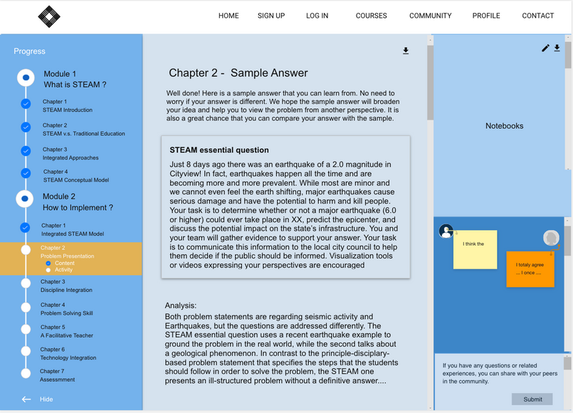 This online professional development course of integrated approach to STEAM education is designed based on comprehensive research on K-8 teachers' current perceptions of STEAM. Setting teachers’ ability to identify and implement STEAM lessons as two major learning goals, this innovative design incorporates various research-based instructional design approaches, including learning theories, evaluation, interaction design, and information representation in order to ensure high usability and satisfactory learning outcome.